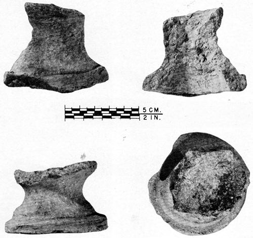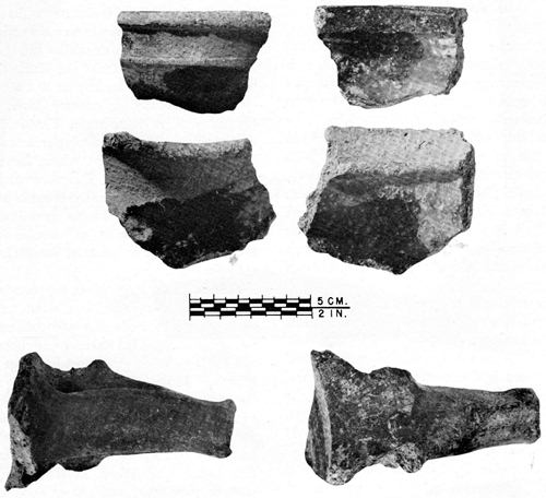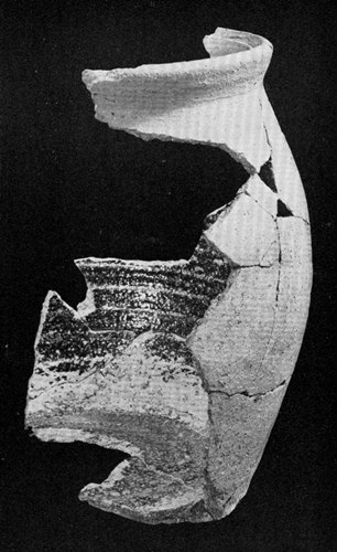 Archeological evidence indicates that gravel-tempered ware was used in America between about 1675 and about 1760. An isolated example of sgraffito pottery, distinguished by crude design and glaze, dates from before 1640. The typical sgraffito ware is illustrated by specimens found in the fill under and around the brick drain in the May-Hartwell site at Jamestown. This ware dates between 1677 and 1695. No other sites provide a more certain dating than this. Sgraffito ware found at Bridge’s Creek, Virginia (John[Pg 59] Washington house site), may date as early as 1664, but may be as late as 1677 or a few years thereafter.