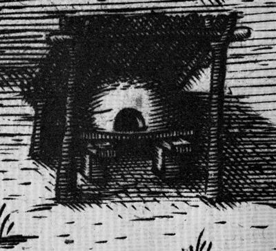 Figure 36.—Detail from De Bry’s engraving of Le Moyne’s painting of Fort Caroline, depicting an oven on a raised platform under a crude shed. Fort Caroline was a French Hugenot settlement established in Florida in 1564. Rare Book Room, Library of Congress.