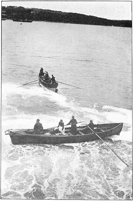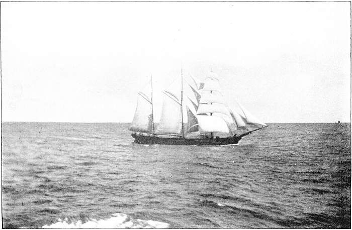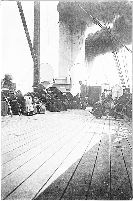 This is our last stop until we reach New York. The anchor is pulled up, and away we go steaming on our homeward voyage. The little steam tug runs along beside us for a time, then the whistles of both vessels blow a farewell to each other, and our little comrade gradually fades from our sight.