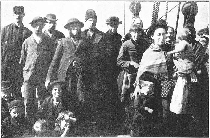 The steamer cuts loose from her moorings, and moves gracefully out into the great ocean. As we approach Queenstown, we observe the small farms and dwellings close to the edge of the water. Then the lighthouse and the forts which guard the entrance to the harbor come into view, and now we drop anchor and wait for passengers and the mails. A little steam tug becomes visible, and as she draws nearer, we learn that she is bearing the mails and passengers to our ship. At last she is close beside us, and when made fast, the transfer takes place. Now is the time for the camera or sketch book, for many typical Irish characters come aboard our vessel, with strange, half-frightened faces, and their worldly belongings carried on their backs, or clutched tightly in their hands. Among the group I notice a middle-aged woman with a young pig nestling peacefully under her arm. Whether it is a pet, or simply a piece of live stock to begin housekeeping with in the new country, I cannot say, but with a contented expression on both faces, Bridget and her pig disappear into the special quarters which are reserved for the emigrants. This whole scene is very interesting. The old-fashioned 354 black glazed oilcloth bag and trunk play a conspicuous part in the picture, and here and there are seen bundles tied in red bandanna handkerchiefs and carried on the end of a stick, which is slung over the shoulder, while the corduroy knee breeches, woollen stockings, heavy shoes and pea-jackets with caps to match give us a fine representation of the Irishman on his native heath.