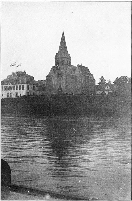 There is a beautiful drive along the river bank, and if one is tired, he may stop at one of the inviting restaurants in this neighborhood, and while resting and refreshing himself, look out at the tourists and others passing along the wide airy street, or as is a common custom, he may have his 324 luncheon served upon the porch, from which there is a delightful and extended view of the Rhine. With plenty of shade and comfortable chairs, and the beautiful river before us, how swiftly the time passes! Sometimes, in consequence of our ignorance of the language, laughable mistakes are made in the ordering of our meals, which seem to increase the jollity of both the waiters and our party. On one of these occasions, while eating our luncheon in the open air, a band of eight or ten street musicians station themselves upon the porch but a few feet from us. They are healthy, hearty-looking men, but contrary to our previous experience in this country, they play the most inharmonious airs. We endure this for a short time, then as the discordant sounds become more and more annoying, we bestow upon the leader a number of small coins, and entreat them to begone. They evidently misunderstand us, and think, from our liberal contribution, that we appreciate their efforts, for they continue their playing with increased vigor and—discord. We do not wish to leave our pleasant quarters, so resign ourselves to the situation. After repeating their repertoire, which seems endless, with profuse smiling bows and thanks they leave us at last to the peaceful enjoyment of the day.