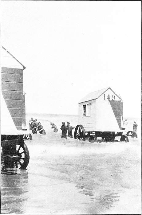Let us descend about noon, by the long low steps, from the promenade to the beach below, and here we will find a long unbroken line of wagons facing the sea. These wagons have large numbers painted conspicuously on their backs: upon one side is a window with a curtain carelessly drawn, and a pair of strong shafts is attached to each vehicle. The stranger will wonder what on earth these unsightly things are designed for, and why they thus mar the beauty of the beach. Have patience; inexperienced stranger, and you will see these inanimate wagons suddenly break ranks and now one, now another be hauled rapidly forward, some to the water’s edge, others into the ocean up to the hubs. In explanation of this I would state that when the bathing hour arrives, a horse is attached to each wagon, and the occupant or occupants, when it reaches the water’s edge, open the door and spring forth a nymph and her companions, in their scant bathing robes, ready for the plunge. The costumes of both men and women are not such as find favor with fastidious mortals, and many of the scenes witnessed on this beach would not be tolerated at any of our American watering-places.