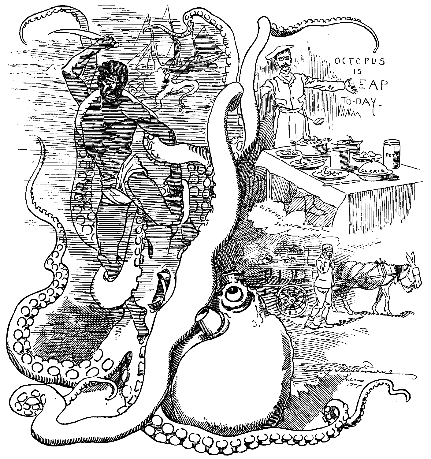 I am a little late, but I can apologise for that. Odd—but I can't find the Amaryllis anywhere! Ask. A seaman on a post says "There was a yacht he see being towed out 'bout 'arf an hour back—he didn't take no partickler notice of her name." No doubt I mistook the moorings—better ask at hotel, perhaps. I do. Waiter says if I am the gentleman by name of Coney, there are two notes for me in Coffee-Room.
