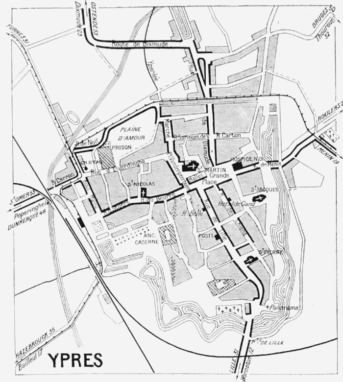 The town of Ypres lies in a sort of natural basin formed by a maritime plain intersected by canals, and dominated on the north, north-east and south by low wooded hills.