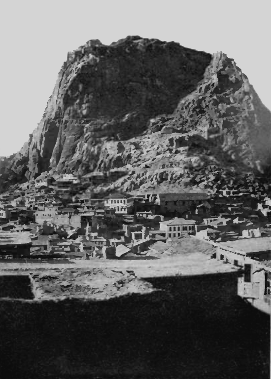 The Armenian Church appears just to the right of the large white building in the centre of the picture, at the foot of the crag