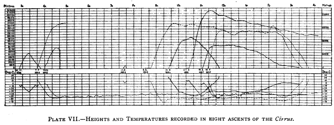 Until quite recently Glaisher's results were accepted as representing the conditions of the free [Pg_77] air up to the greatest height which it was possible to reach. These results showed that the temperature did not fall uniformly with height, but that it fell most rapidly near the earth and much less rapidly at great heights. In cloudy weather up to the height of a mile the mean decrease of temperature in the day-time differed little from the theory of 1° per 300 feet, but in clear or partly clear weather the decrease was more rapid, commencing with 1° for 160 feet near the ground and diminishing to 1° for 1000 feet at an elevation exceeding six miles. The observations in the captive balloon up to a third of a mile indicated a daily range in the vertical decrease of temperature. The observations of relative humidity agreed with Welsh's in showing a slight increase up to about half-a-mile, then a decrease up to above five miles, where there seemed to be an almost entire absence of water. The other observations were inconclusive, except that the time of vibration of a magnet was found to be somewhat longer than on the earth, which was contrary to Gay-Lussac's experience. The most remarkable of Glaisher's ascents was made from Wolverhampton on September 5, 1862, when in less than one hour he had passed the altitude of five miles, exceeding the greatest height hitherto reached. To quote from Glaisher's narrative: "Up to this time I had taken observations with comfort and experienced [Pg_78] no difficulty in breathing, whilst Mr. Coxwell, in consequence of the exertion he had to make, had breathed with difficulty for some time. Having discharged sand, we ascended still higher; the aspirator became troublesome to work, and I also found a difficulty in seeing clearly…. About 1 hour 52 min., or later, I read the dry-bulb thermometer as minus 5°; after this I could not see the column of mercury in the wet-bulb thermometer, nor the hands of the watch, nor the fine divisions of any instrument. I asked Mr. Coxwell to help me to read the instruments. In consequence, however, of the rotatory motion of the balloon, which had continued without ceasing since leaving the earth, the valve-line had become entangled, and he had to leave the car and mount into the ring to readjust it. I then looked at the barometer, and found its reading to be 9¾ inches, still decreasing fast, and implying a height exceeding 29,000 feet. Shortly after, I laid my arm upon the table, possessed of its full vigour, but on being desirous of using it, I found it powerless…. Trying to move the other arm, I found it powerless also. Then I tried to shake myself and succeeded, but I seemed to have no limbs…. I dimly saw Mr. Coxwell, and endeavoured to speak, but could not. In an instant intense darkness overcame me, so that the optic nerve lost power [Pg_79] suddenly, but I was still conscious, with as active a brain as at the present moment whilst writing this. I thought I had been seized with asphyxia, and believed I should experience nothing more, as death would come unless we speedily descended; other thoughts were entering my mind, when I suddenly became unconscious…. I cannot tell anything of the sense of hearing, as no sound reaches the air to break the perfect stillness and silence of the regions between six and seven miles above the earth. My last observation was made at 1 hour 54 min., above 29,000 feet…. Whilst powerless I heard the words, 'temperature' and 'observation,' and I knew Mr. Coxwell was in the car speaking to and endeavouring to rouse me…. I then heard him speak more emphatically, but could not see, speak, or move. I heard him again say, 'Do try; now do!' Then the instruments became dimly visible, then Mr. Coxwell, and very shortly I saw clearly…. Mr. Coxwell told me that while in the ring he felt it piercingly cold, that hoarfrost was all round the neck of the balloon, and that on attempting to leave the ring he found his hands frozen. He had, therefore, to place his arms on the ring and drop down…. He wished to approach me, but could not; and when he felt insensibility coming over him too, he became [Pg_80] anxious to open the valve. But in consequence of having lost the use of his hands he could not do this; ultimately he succeeded, by seizing the cord with his teeth, and dipping his head two or three times, until the balloon took a decided turn downwards. No inconvenience followed my insensibility; and when we dropped, it was in a country where no conveyance of any kind could be obtained, so I had to walk between seven and eight miles…. I have already said that my last observation was made at a height of 29,000 feet; at this time (1 hour 54 min.) we were ascending at the rate of 1000 feet per minute; and when I resumed observations we were descending at the rate of 2000 feet per minute. These two positions must be connected, taking into account the interval of time between, viz. 13 minutes, and on these considerations the balloon must have attained the altitude of 36,000 or 37,000 feet. Again, a very delicate minimum thermometer read minus 11°.9, and this would give a height of 37,000 feet. Mr. Coxwell, on coming from the ring, noticed that the centre of the aneroid barometer, its blue hand, and a rope attached to the car were all in the same straight line, and this gave a reading of seven inches and leads to the same result. Therefore, these independent means all lead to about the same elevation, viz. fully seven miles."