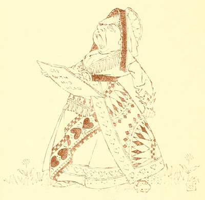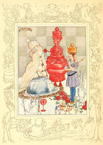 To the Looking-Glass world it was Alice that said, "I've a sceptre in hand, I've a crown on my head; Let the Looking-Glass creatures, whatever they be, Come and dine with the Red Queen, the White Queen, and me!" Then fill up the glasses as quick as you can, And sprinkle the table with buttons and bran: Put cats in the coffee, and mice in the tea— And welcome Queen Alice with thirty-times-three! "Oh, Looking-Glass creatures," quoth Alice, "draw near! 'Tis an honour to see me, a favour to hear: 'Tis a privilege high to have dinner and tea Along with the Red Queen, the White Queen, and me!" Then fill up the glasses with treacle and ink, Or anything else that is pleasant to drink; Mix sand with the cider, and wool with the wine— And welcome Queen Alice with ninety-times-nine! |