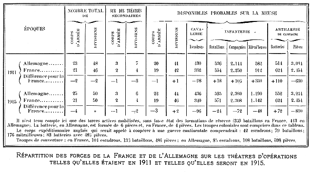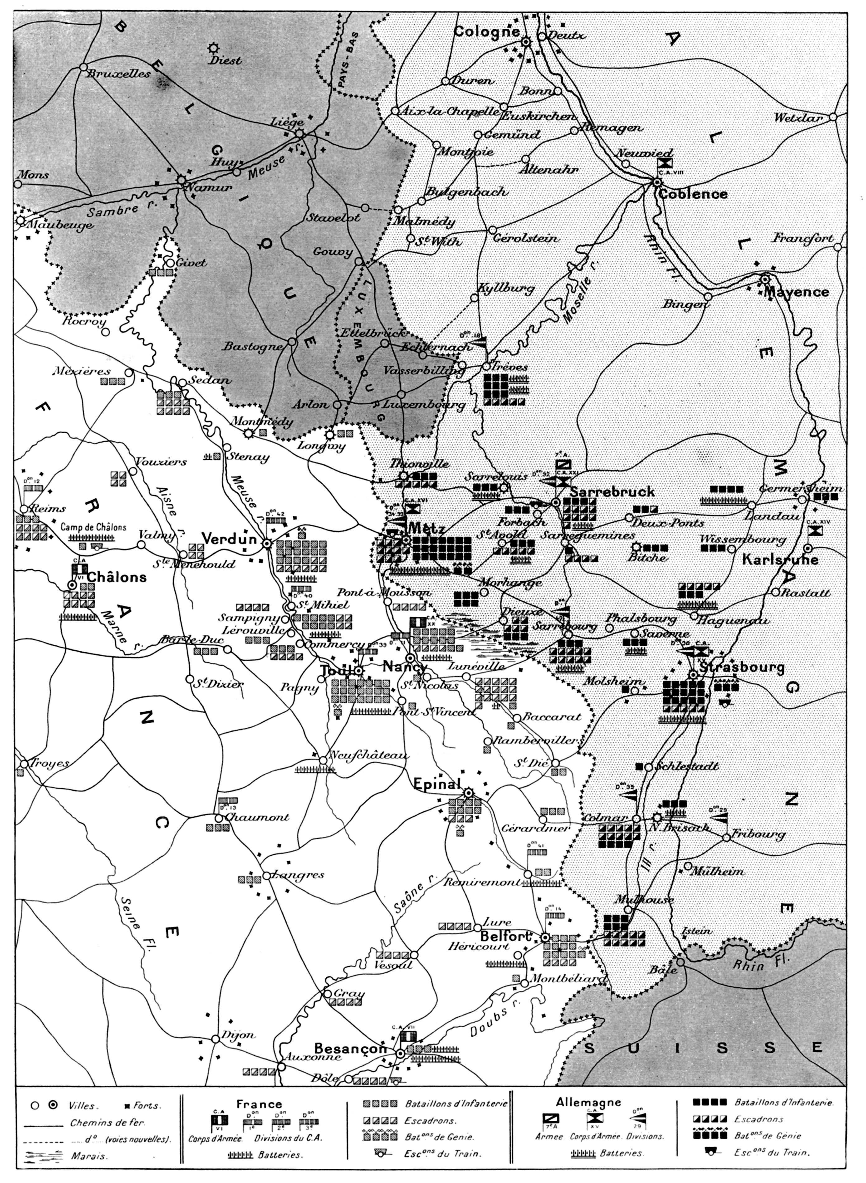 Les voies nouvelles, indiquées sur la carte et qui seront achevées prochainement, ont pour objet de relier le Rhin à la frontière belge et au Luxembourg; d'après les Allemands eux-mêmes, elles pourraient assurer les transports de 6 à 7 corps d'armée.