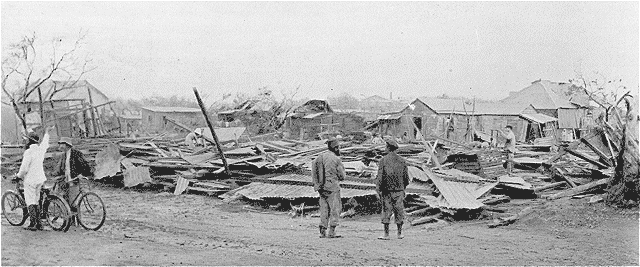 Ce fut le dimanche 24 novembre que se déchaîna le cyclone. Pendant la moitié de la nuit il fit rage. Les frêles baraques de bois et de tôle qui constituent là-bas la plupart des habitations furent, en un clin d'oeil, découvertes, renversées, broyées, comme paille. Les maisons même plus solidement construites, les bâtiments administratifs, ne furent pas épargnés non plus. Les habitants, blottis dans les abris les plus invraisemblables, passèrent d'effroyables heures, attendant d'un moment à l'autre la catastrophe suprême.