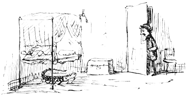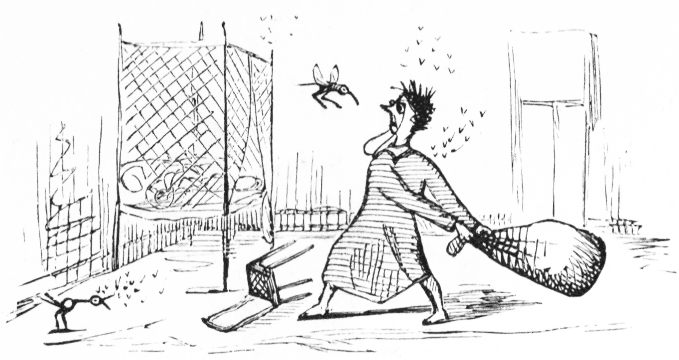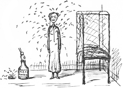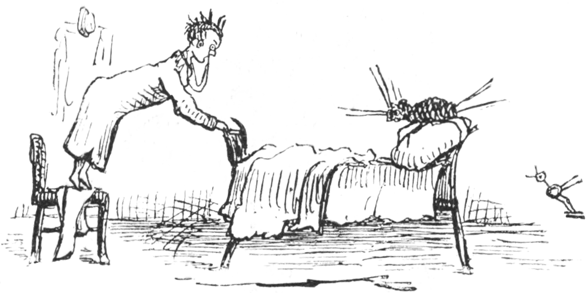 Having been nearly devoured by these carnivorous little devils, Our Artist sprinkles himself with Turkish flea-powder one night before retiring, and is charmed at the rapid and parabolic manner with which they desert him.