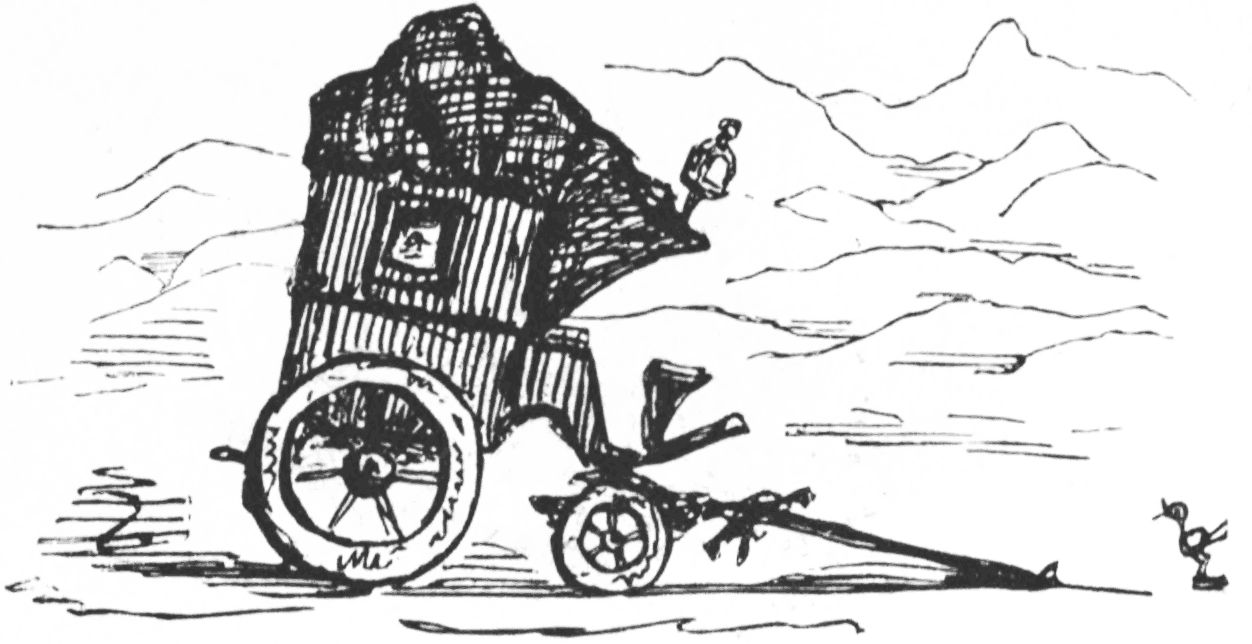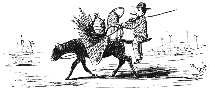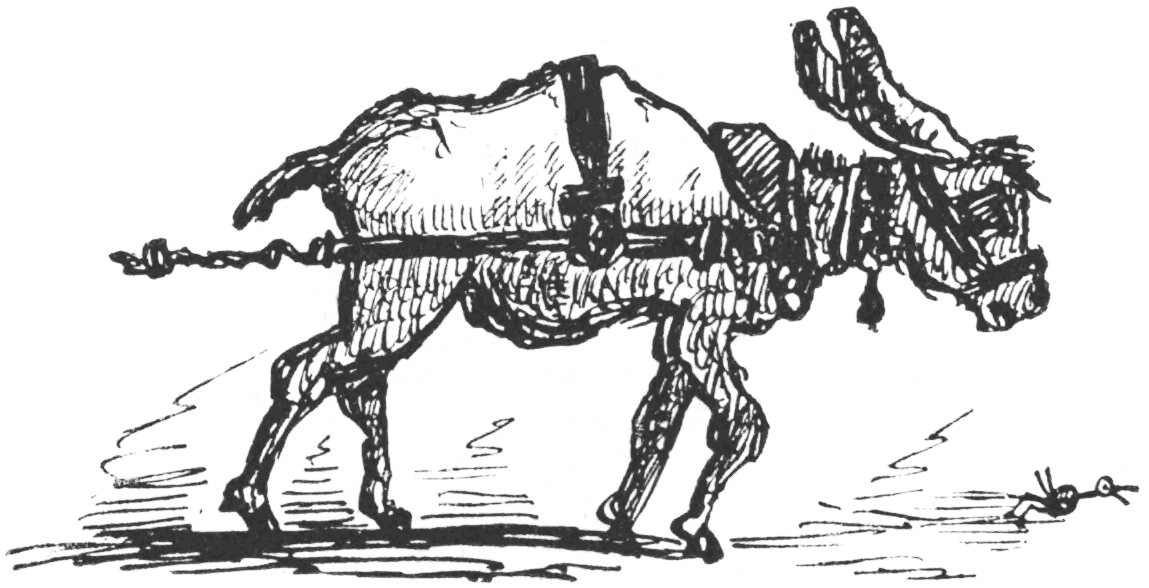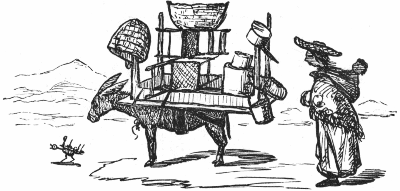 Our Artist had heretofore fancied that it would be immensely jolly to ride one of these singular beasts of burden; but when he encounters this one, on a lonely road outside the walls one day, he begs to be excused.