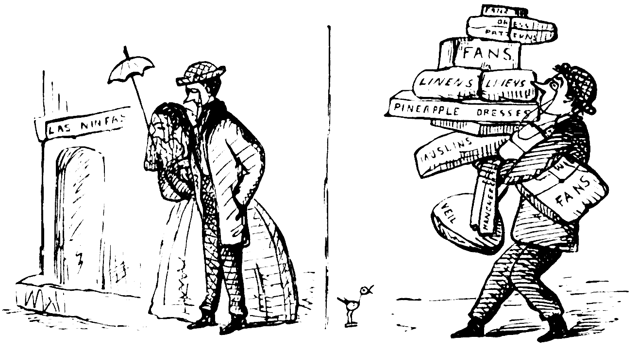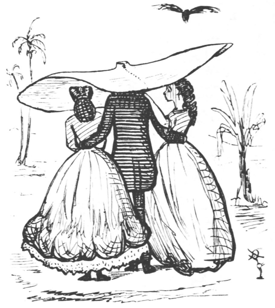 Deeming it always incumbent upon the traveller to invest in the products of the country, Our Artist provides himself with a good sensible Panama hat, and thus with wife and "mutual friend," he peacefully and serenely meanders around among the suburbs of the city.