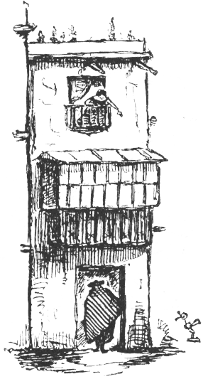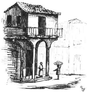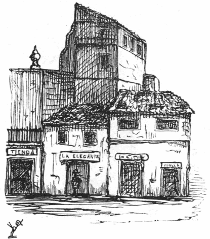 Sketch of a private residence in Calle San Pablo; from the upper Balcony of which, Our Artist had a rose thrown to him, while a cloaked Assassin of a probable Lover, glowered savagely at him from the doorway.
