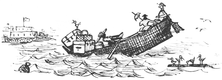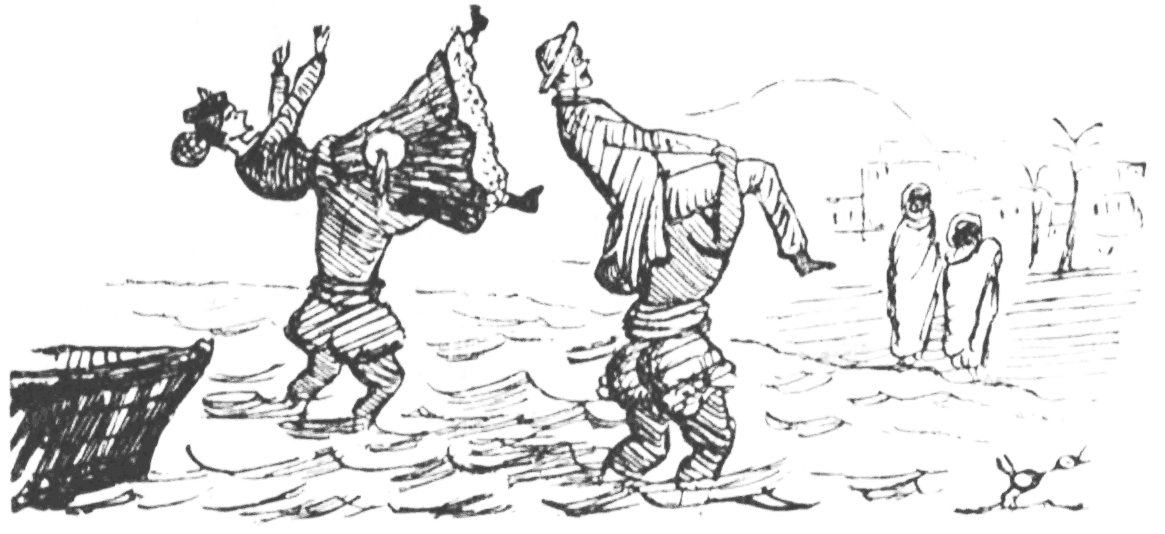 We leave Gibraltar by Steamer, and upon reaching the city of NEMOURS, Our Artist and his Better-Half are taken ashore from the small boat by the Natives in this summary manner!—A couple of inviting Hotel-keepers are awaiting them on the beach.