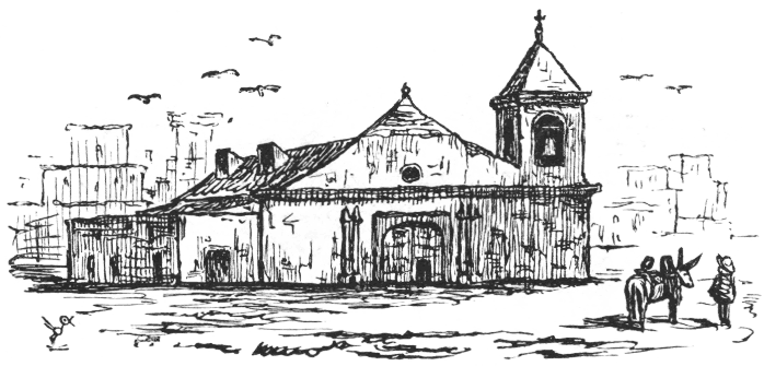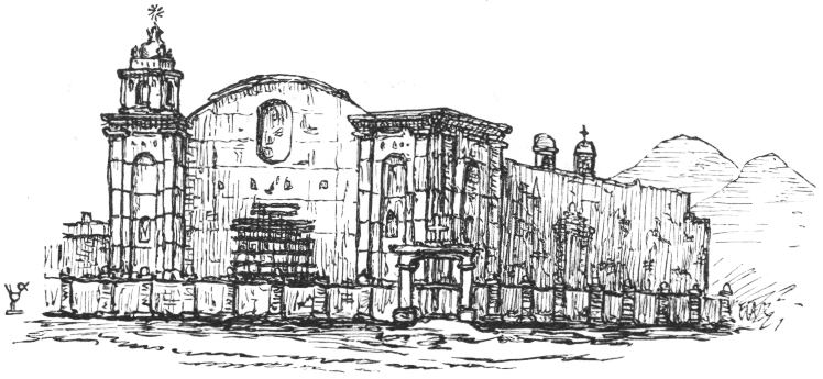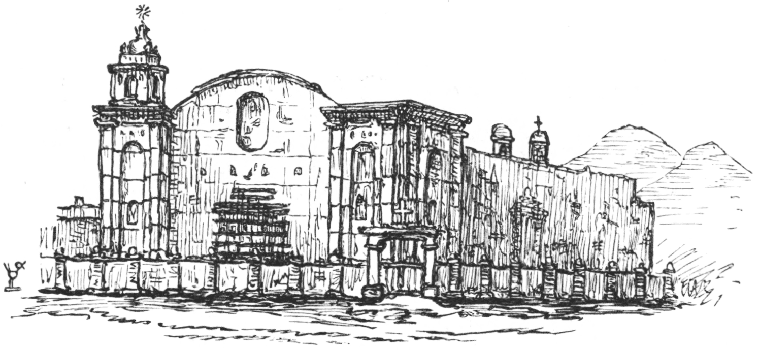 The little one-story Cathedral on the Plaza, which the earthquakes have so frantically and so vainly tried to swallow up or tumble down.