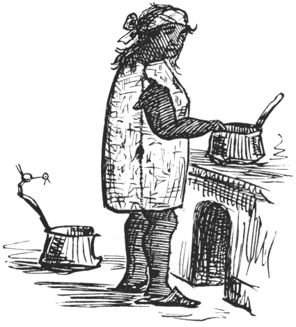 Peeping into the kitchen one day, Our Artist perceives that a costume, cool and negligé, may be improvised by making a hole in a coffee-bag and getting into it.
