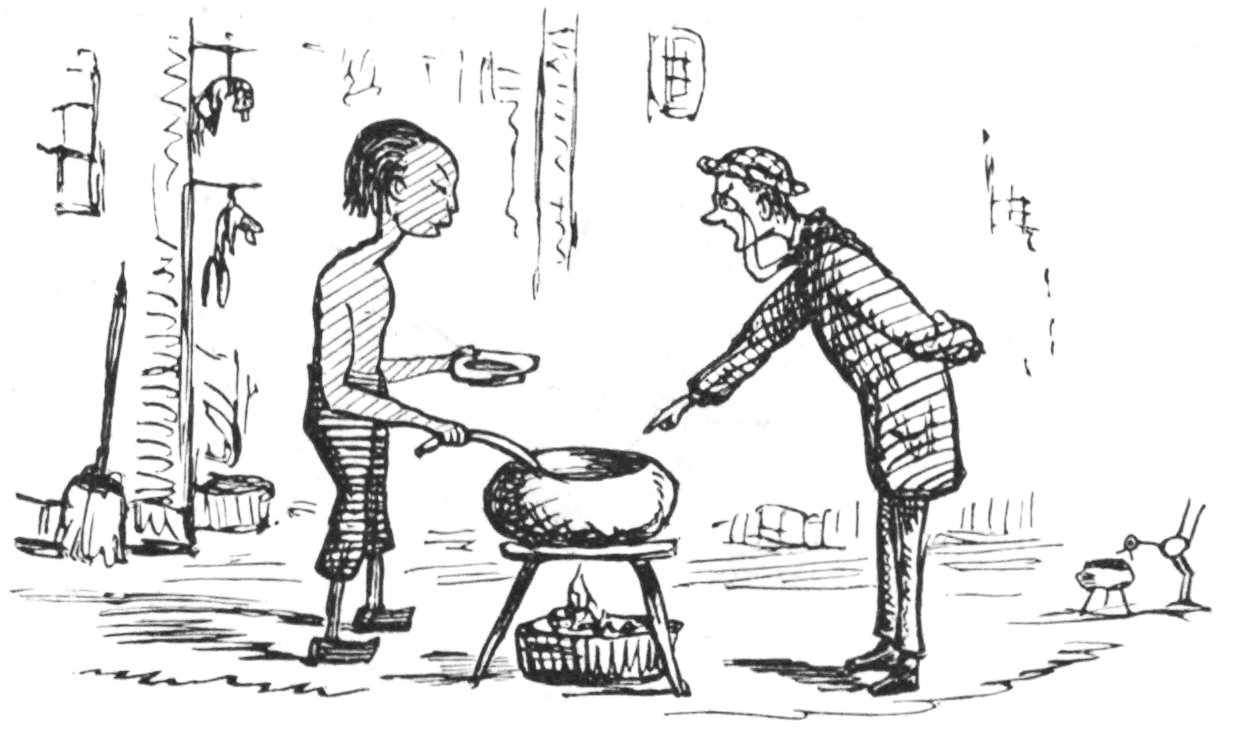 Our Artist is here seen resisting the tempting offer of a bowl of what appears to be buzzard soup, in front of one of the Chinese cook-shops that abound in the neighborhood of the market at Lima.