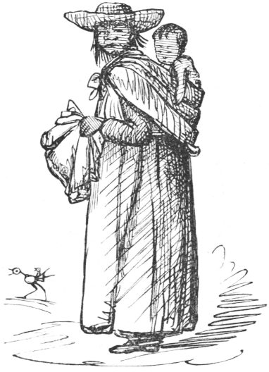 A Peruvian materfamilias, having bought a few simple house-keeping articles in town, is here seen returning to her mountain home, accompanied by her purchases.