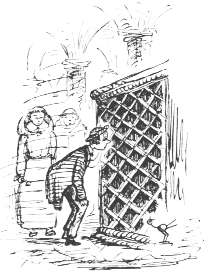 Having been informed by a musty old sepulchral monk that the remains of Pizarro might be seen behind this grating, Our Artist tremblingly gazes therein—but as it is pitch dark, he doesn't recognize Pizarro.