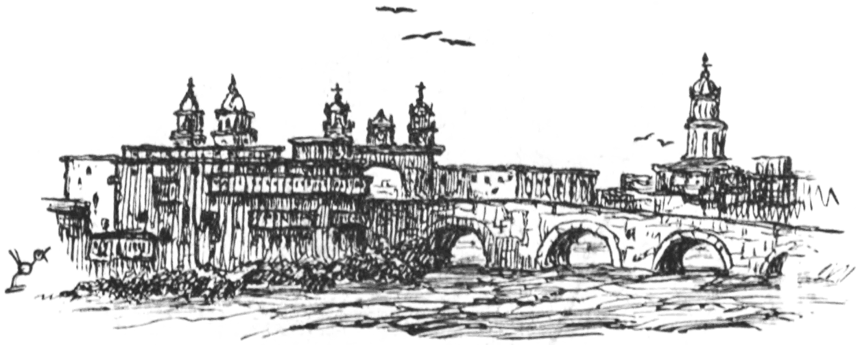 A picturesque view of the great stone bridge over the rapid river Rimac, showing the towers of the church Desamparados, the Arch with illuminated clock, and the spire of Santo Domingo.—Sketched with about ninety-seven Peruvian beggars looking over Our Artist's shoulder.