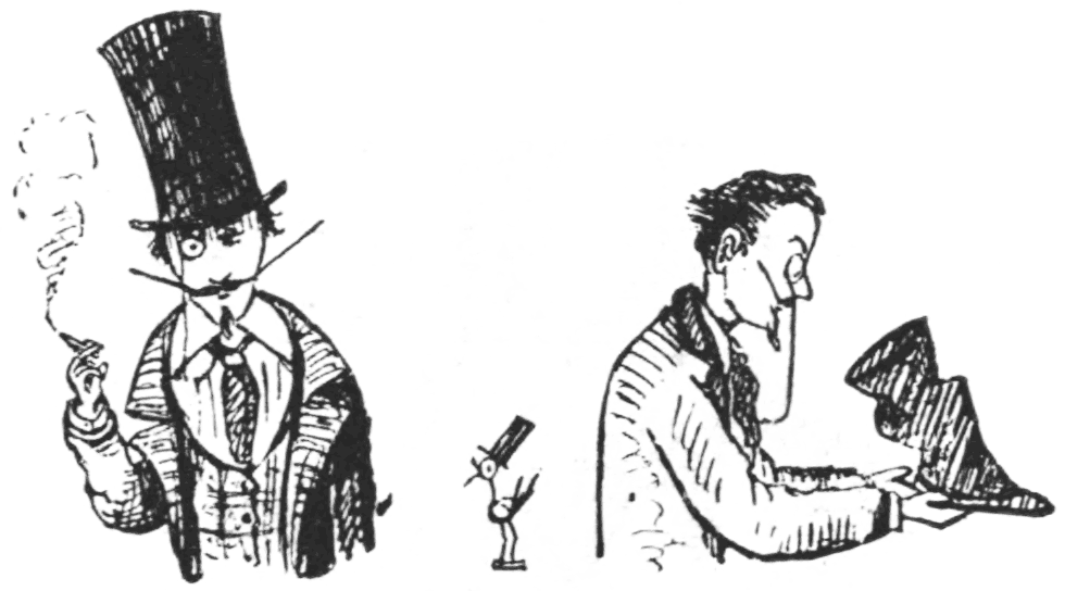 This is a Spanish Dandy at the Grand Opera House in MADRID:—first, with his cigarette and new Hat of the period; second, after his Hat had been sat upon by a fat old Señora, during the third act of Lucia di Lammermoor.