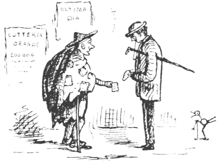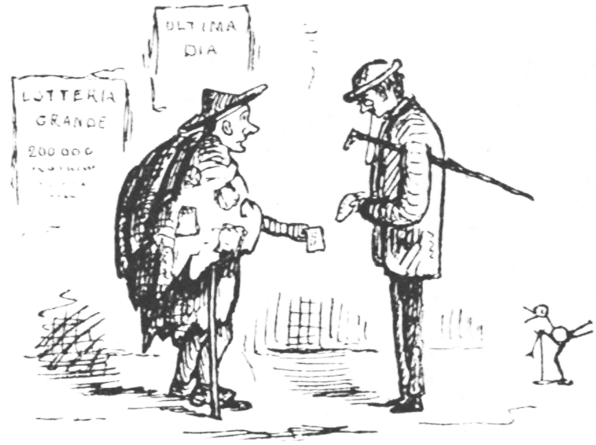 Nearly all the Lottery tickets in Spain are publicly sold in the streets by Beggars: and this is the sort of Vagabond in MADRID to whom Our Artist confided $16 for a ticket that won a prize of $5.
