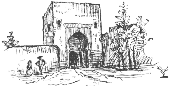 Sketch of the famous Gate of Justice, the principal modern Entrance to the far-famed Moorish Palace of THE ALHAMBRA—with a little Spanish Flirtation going on in the corner.