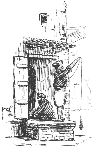 Sketch in the Rue Kasbah.—A couple of Moorish Jews, engaged in silk spinning, at the door of their palatial residence.