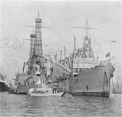 Une division navale américaine, composée des cuirassés Vermont et Ohio, au cours d'une croisière en Méditerranée, va passer quelques semaines dans les eaux françaises. Ces cuirassés sont actuellement à Marseille, où a été prise notre photographie. Ils y ont grand succès de curiosité, avec leurs étranges mâts-tourelles. Mais ce qui retient le plus vivement l'attention des marins comme des simples... terriens, c'est le transport Orion qui les accompagne et qui est spécialement chargé de les ravitailler en charbon. C'est un navire d'un type tout nouveau et qui vient d'être mis en service récemment. Il peut porter 10.500 tonnes de houille. Il présente un aspect très particulier, avec son pont chargé de grues puissantes qui lui permettent de charger rapidement les navires qui peuvent avoir recours à ses services. De tels bâtiments pareraient heureusement, en temps de guerre, aux difficultés toujours grandes du ravitaillement.
