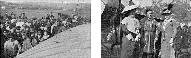 | A Varna, en Bulgarie, au bord de la mer Noire: la foule entourant le monoplan qui vient d'atterrir.--Phot. H. Roux. | Daucourt ayant à sa droite Mme Duchesne, femme du consul de France, à sa gauche Mme Stancioff, femme du ministre de Bulgarie à Paris. |