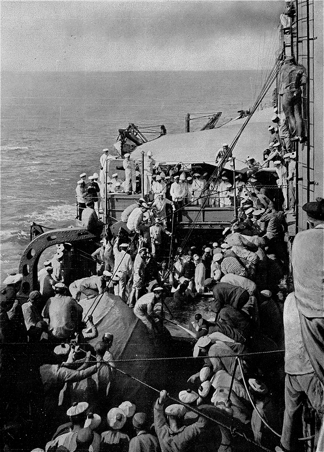 Quels souvenirs ces mots «baptême de la ligne» éveilleront dans les mémoires des hommes qui prirent le goût de lire avant l'invention du roman policier! Mais les enfants d'à présent ont-ils seulement feuilleté Robert-Robert, et connurent-ils les frissons de Toussaint Lavenette au passage de la ligne? Sinon, ils ne savent pas de quelles émotions ils sont privés. Les pittoresques, les amusants récits que c'étaient, dans les romans d'aventure de notre jeunesse, ceux qui décrivaient cette burlesque cérémonie: la descente des hunes du courrier, la veille du grand jour; l'arrivée, par le même chemin du ciel, du «père Trois Piques» et de sa jeune épouse,--et puis, le bain, dans la baille aménagée à cet usage, des passagers et des matelots qui passaient pour la première fois l'Equateur... Or, tout cela, on est heureusement surpris de le constater, a été conservé scrupuleusement dans notre marine de guerre, gardienne fidèle des bonnes traditions, et l'on peut voir par cette photographie prise il y a quelque temps sur la Jeanne-d'Arc, croiseur-école des aspirants, au cours d'un voyage, entre Madère et Rio de Janeiro, que les novices de la mer sont baptisés selon tous les rites que subirent, de bonne humeur, leurs devanciers. C'est une journée de repos, de détente au milieu des occupations sévères du bord. Le lendemain, la discipline reprend ses droits et chacun se remet à son devoir.