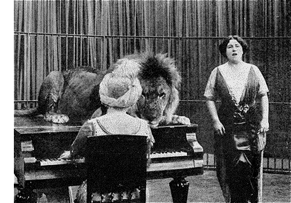 La fantaisie d'un auteur de scénarios, d'imagination fertile, a voulu que Mlle Emmy Destinn vînt chanter devant un lion, dans sa cage même.