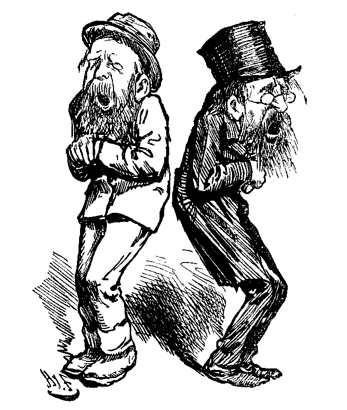 On the Beach again.—Cheap photographers, galvanic machines, chiropodist, tea-stalls, grim old ladies eating shrimps, as if they were cherries, out of paper bags. Open-air music-hall, where comic songs are shouted from platform by dreary men in flaxen wigs to harmonium—this always crowded. Enjoyment at Starmouth hearty perhaps—but hardly refined. Constantly haunted by song from open-air platform about "The Gurls," with refrain describing how "they squeeze, And they tease. And they soy, 'Oh, what joy!'" (or perhaps it should be—"sigh, 'Oh, what jy!'") Either way, it has hit the popular taste here. I may be prudish—but, even if a couple are engaged, it seems to me that a nicer sense of propriety would deter them from dozing in a sand-pit, coram publico, with their arms around one another's neck. Nobody thinks anything of this at Starmouth, however.