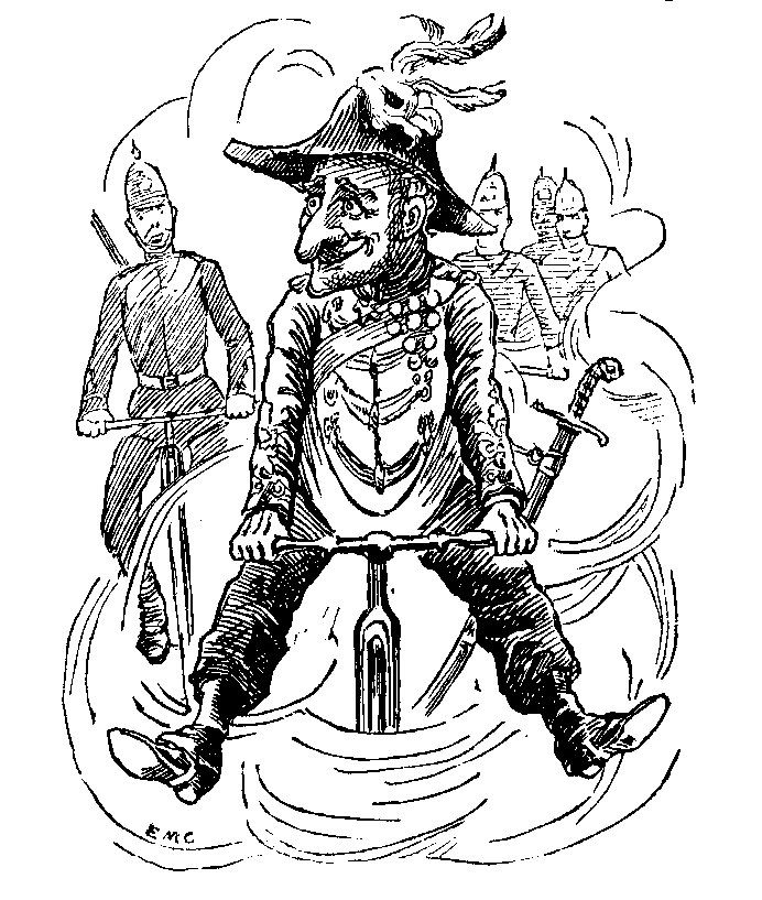 Monday.—His Serene and Blind Highness still here, dutifully taking waters, and pluckily striding forth to complete regulation-turns. No one would guess at his affliction, except upon close observation. A photographic portrait of him on view in one of the Studios here, in which he looks forth open-eyed as keenest-sighted of his subjects; a kindly, genial, brave-hearted gentleman. All unconscious, he is made the occasion for a little satire on Royalty which would have delighted Thackeray. To him ladies, entering into passing conversation, curtsey; gentlemen doff their hats; and Jeames de la Pluche stands bare-headed as he hands him glass of water from spring. It is horrible to think that Jeames might, with impunity—there being no on-lookers—shake his fist playfully in his Royal Master's face. Hope he never takes base advantage of his opportunities. But there is a look in Jeames's eye, as he hands the glass of water, which melikes not.