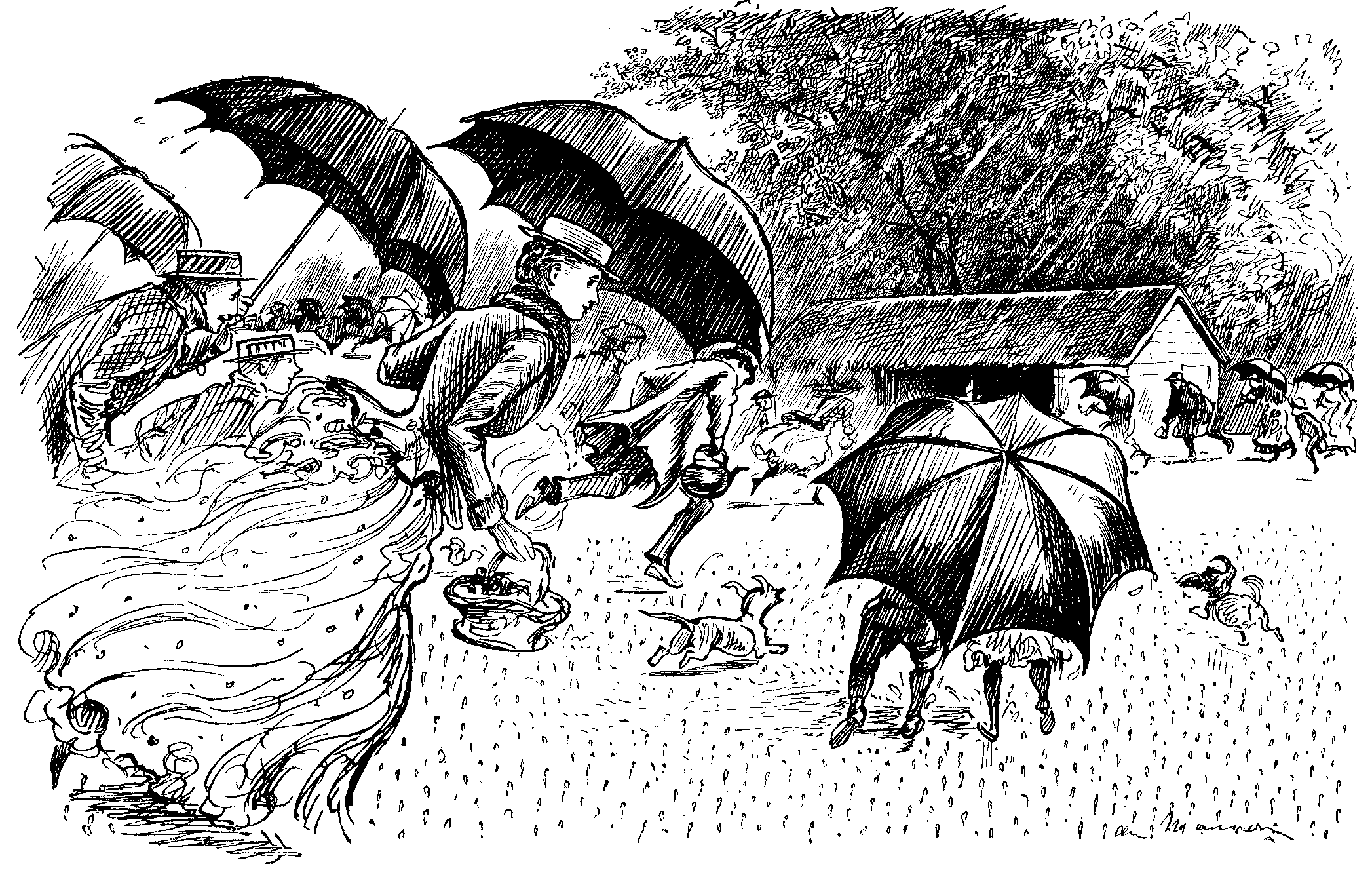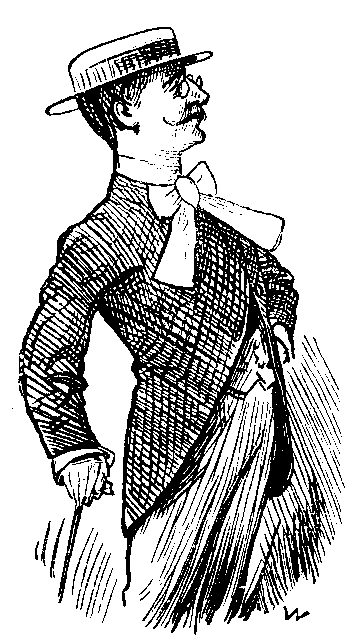 I subdue my diffidence, and embark—that is, I fall over the stern, and stumble to the only vacant seat—a thwart in the middle. Should have preferred a place nearer the gunwale.... We are off; boat pretty full, twenty-four passengers, to crew of two boatmen and a cornet-player. People enjoying what they call "a blow on the jetty," wave handkerchiefs to us as we pass. Curious, this blind impulse to wave greetings to perfect strangers—does it spring from vague enthusiasm for humanity? Chatty old gentleman next to me will talk: he tells me confidentially that it is a singular thing, but it does so happen that he has never been on the sea without an accident of some sort occurring,—never! There is no superstitious nonsense about him, it seems, so he thought he would "chance it" once more. Very creditable—but more considerate if he would chance it in a canoe. The Cornet-player quite a cockney Arion (though nobody thinks, somehow, of pitching him overboard). He performs appropriate airs during trip. A Life on the Ocean Wave, as we start; Only a Pansy Blossom, (though I don't see the precise connection of this) as we tack; and the Harbour Lights, when we turn. Somehow, this rather vulgarises the Ocean—for me. Sea fortunately smooth: nobody at all unwell. I feel nothing—except perhaps a growing conviction that a very young infant opposite should not be permitted to eat a jam-puff in public. Boatmen use no nautical expressions. Passengers lively at first, though, by time we turn, the expression on our features, like that of young lady who wore the wreath of roses, seems "more thoughtful than before." We are close in now—the musician is sending round his hat. Resent this privately, it is not seamanlike! In beaching, yacht swings round with her broadside to breakers, causing sudden wave to drench the Jonah gentleman and myself before we can disembark. He seems rather gratified than otherwise by so apposite an illustration of his ill-luck. The brown-eyed girl on sands watches me alight—on all fours, dripping. Sea-trip a mistake, I feel damped rather than fired.