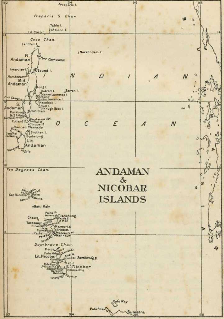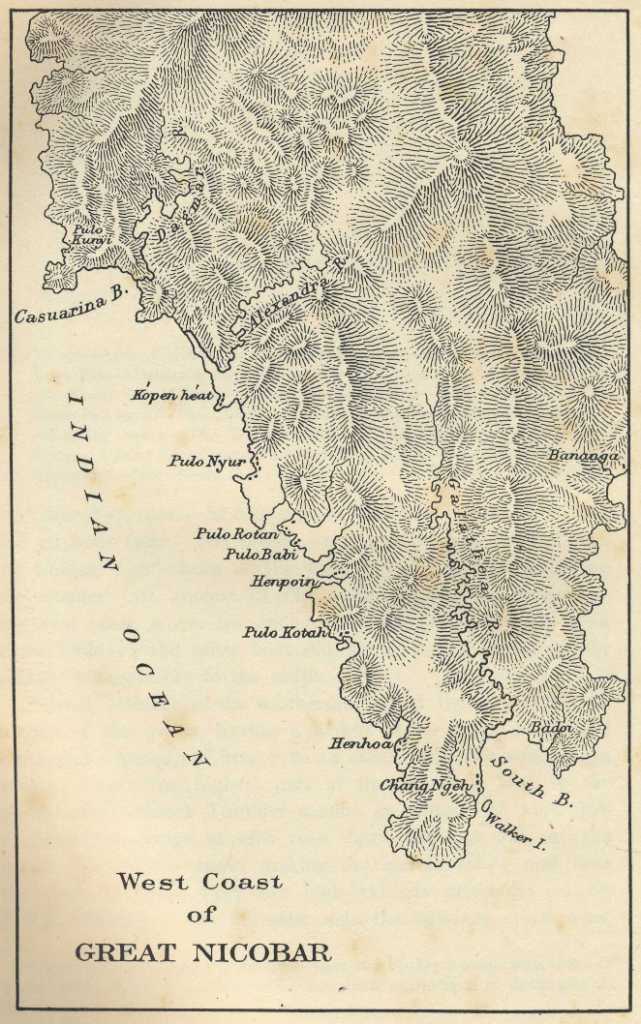 Of those who entertained and assisted us during the voyage, thanks are specially due to Mr P. Vaux of Port Blair, for his hospitality to us during our stay in that place;[2] and I am greatly indebted to Messrs O. T. Mason, G. S. Miller, and Dr C. W. Richmond, respectively, for the photographs of the Nicobarese pottery and skirt, for permission to include here much information from the report on the Andaman and Nicobar mammals, and for a list of the new species of birds obtained, which, however, up to the present, have not received specific designations. I have also to gratefully acknowledge the help rendered me by Mr E. H. Man, C.I.E., who, besides volunteering to read through the proof sheets, has given me much information, and corrected a number of inaccuracies. To my sister, for her superintendence of the book since my departure from England, and to my publishers for their kindness and assistance in many ways, I must not omit to offer my thanks.