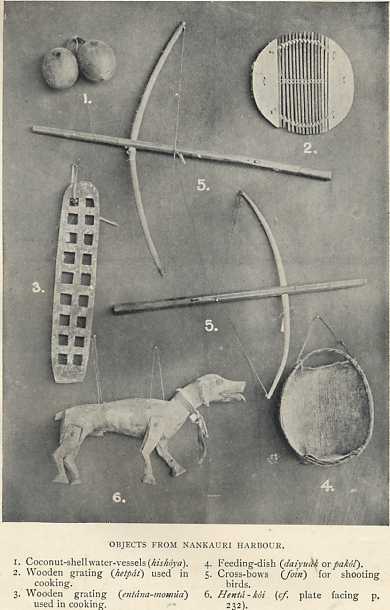[215] "I was present on a certain occasion at Mūs ... having brought Tanamara with me from Nankauri. In strolling through the village we caught sight of a fine large canoe, which he recognised as having been sold by him to a certain native of Chaura. Offandi proved to be the owner, and he, on being questioned, said that he had bought it from the same man. On further enquiry it was found, that while the Chaura middleman had promised to give 25 rupees in kind to Tanamara (only part of which had yet been paid), he would not let Offandi have it till he had delivered to him a long list of articles (e.g. cloth, spoons, tobacco, etc.), which, on being totalled up, were found to amount to about 105 rupees in value."—E. H. Man.