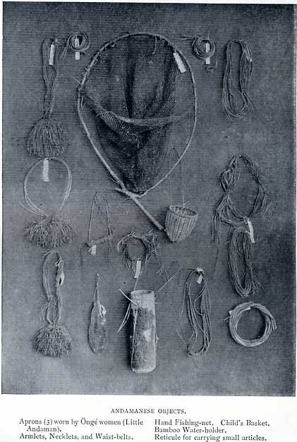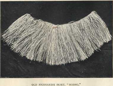 [179] For the dress used at various periods, refer to the authorities quoted in other chapters. The earliest clothing—apart from ornamental cords and string bracelets, etc., as are still used by the Andamanese—seems to have been, for the men a strip of bark cloth, and for the women a short petticoat of grass or coco-palm leaf (ngong).