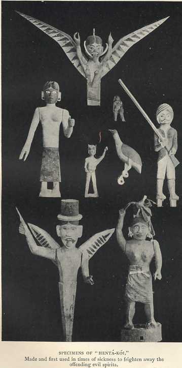 (d) "The inland tribes of Borneo are without any definite forms of religious worship; they make idols of wood, but I have never seen any offerings made to them, nor do they regard them apparently as anything more than scarecrows to frighten off evil spirits."—Folklore in Borneo, by W. H. Furness.