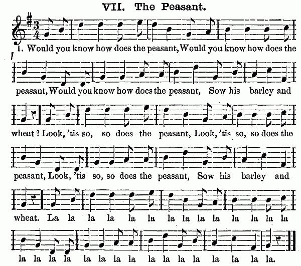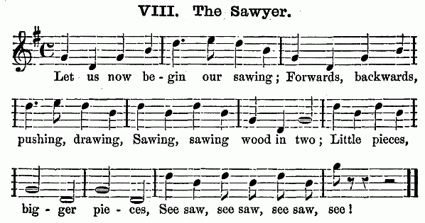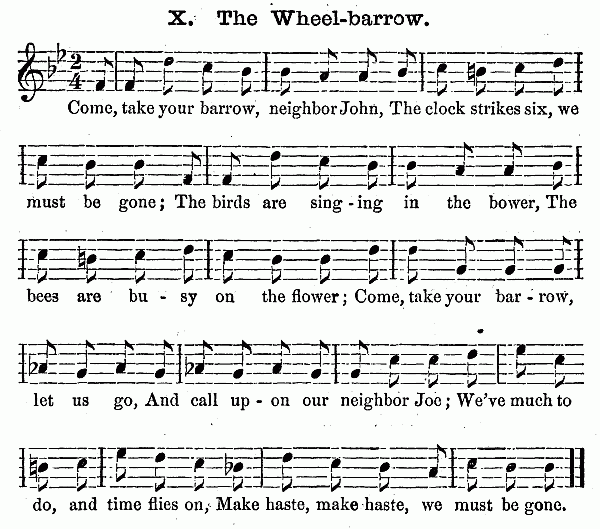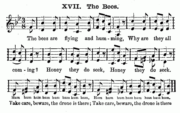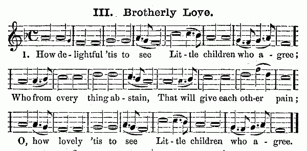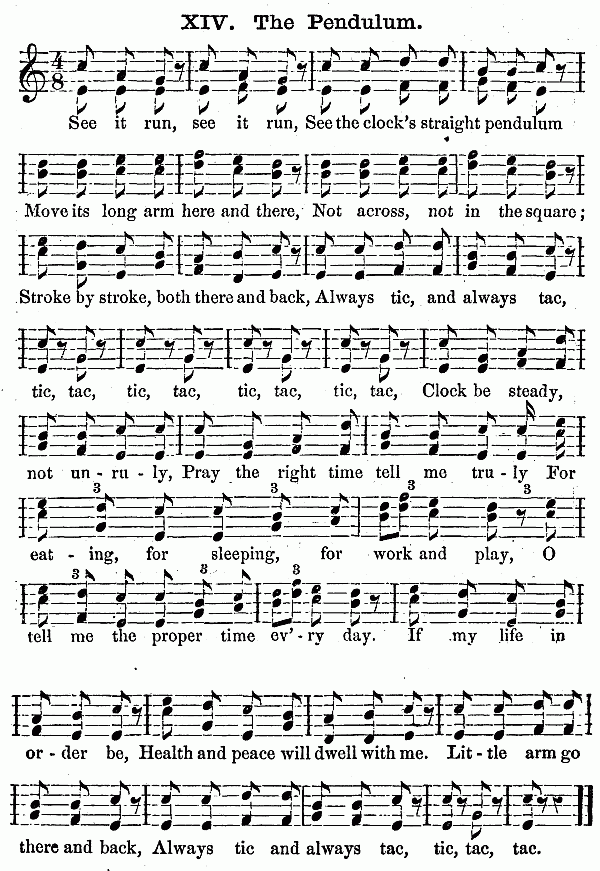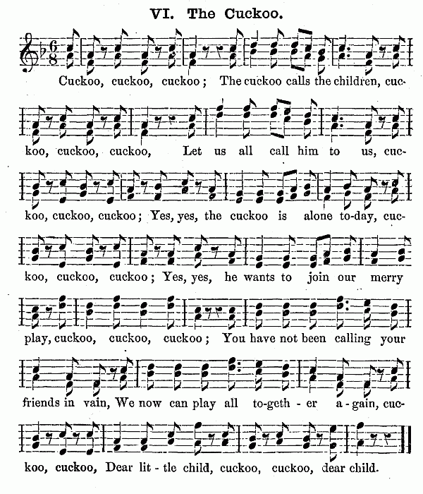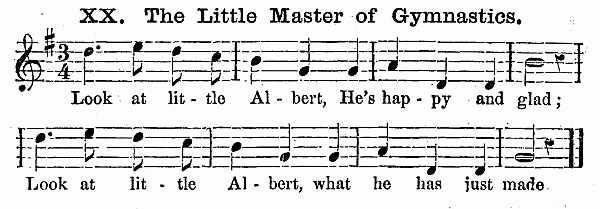 Besides these ten minutes on the scale, (which should not occur next to singing the hymn, but after some other exercise has intervened,) it is an excellent plan to let the Kindergarten close with singing songs by rote. The words should be simple, such as "The Cat and the Sparrow," and other pretty melodies to be found in the Pestalozzian Singing Book and the many compilations prepared for children. For it is well for the child not to go out of the natural octave, and to have the words of songs adapted to the childish capacity. Besides this singing, the piano-forte should be used to play marches, as the children go from one room to another to their different exercises. "Order is Heaven's first law," and music is the heavenly voice of order, which disposes to gentleness and regularity of motion. As all the exercises change every quarter of an hour at least, this brings the marching to music as often; and it will last one or two minutes, sometimes longer. The children get accustomed to rise at the sound of the piano, and it will be easy to make them silent during the music, especially if it is hinted to them that soldiers always march in silence. Besides this, the piano is necessary for the gymnastics, and for the fanciful plays, which are always to be accompanied by descriptive songs.