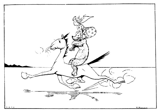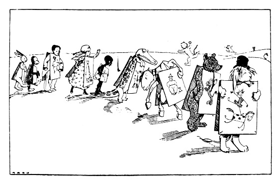 [127]Long hours of waiting followed. In thought Baby Jane saw the Rabbit racing furiously mile after mile across the dark desert, growing tired and panting till his heart was nearly bursting; but galloping, galloping on. Now his little muscles gave out utterly, and yet he went galloping on—with his soul. At last, with eyes growing dim, he saw a palm slender and black against the starlit sky, and round it wide dark shadows—the sleeping regiments of Baby Jane's army.