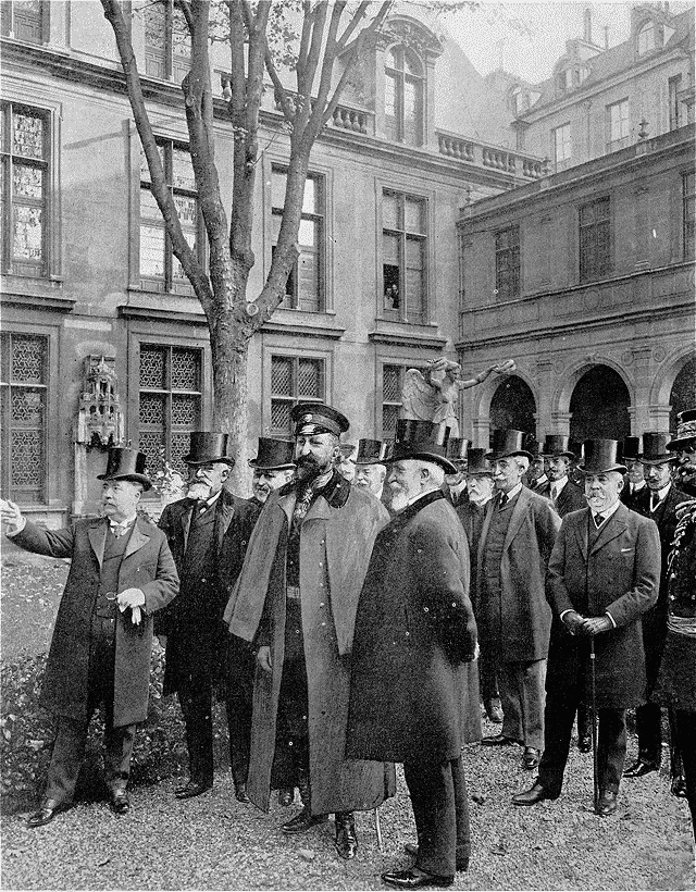 Le mercredi 18, après avoir assisté, le matin aux manoeuvres de Vincennes et au déjeuner militaire offert par M. Berteaux, ministre de la Guerre, il allait visiter le musée Carnavalet, au seuil duquel M. Dujardin-Beaumetz, sous-secrétaire d'État aux Beaux-Arts, et M. Cain, le conservateur, lui souhaitaient la bienvenue; puis les collections artistiques de la ville de Paris, au Petit Palais des Champs-Elysées. Le soir, dîner offert par M. Rouvier, au quai d'Orsay.