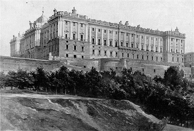 Le Palais Royal de Madrid, où logera M. Loubet, date, du dix-huitième siècle; il a remplacé le palais incendié en 1734 et qui avait succédé à l'Alcazar des Maures. Il est bâti, comme l'Escurial, sur une hauteur dominant la capitale et la plaine où coule... parfois le Manzanarès. Entièrement construit en granit, avec des motifs décoratifs en une pierre spéciale imitant le marbre, flanqué de tours aux quatre angles, il séduit moins par les détails de son architecture que par la régulière ordonnance de ses lignes.
