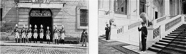 | Cavaliers de l'escorte royale devant leur caserne. | Les hallebardiers, sur un palier de l'escalier d'honneur du Palais Royal. |