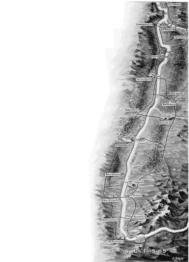 Avec une vitesse de 4 mètres par seconde (14 kilom. à l'heure), qui est la vitesse des eaux rhénanes entre Bâle et Strasbourg, les redoutables mv dévalent, en torrent, la pente du Rhin. Ils se suivent à quelques secondes d'intervalle. Tantôt ils sont arrêtés par la vase, le sable ou les herbes du fleuve, mais le courant les reprend; tantôt ils butent contre un obstacle, bois, fer ou pierre, et le détruisent. Puis, d'autres mines succèdent aux premières. De plus en plus loin, elles s'en vont, semant la destruction et la ruine. La vitesse acquise imprime à ces engins une force de percussion terrible. Un roulement de tonnerre déferle sur les flots, en même temps qu'eux, le cyclone descend. Le Rhin bouillonne, grossit, éclabousse, se projette de-ci de-là, en vagues de 20 mètres de hauteur. Plus les obstacles sont puissants et mieux ils sont brisés: rien ne trouve grâce devant ce souffle de mort. Impossible de s'exposer, fût-ce un quart d'heure, sur des eaux qui véhiculent la mort. Les hommes, les animaux qui se risquent à traverser le courant sont emportés par le remous des eaux, quand ils ne sont pas heurtés par les torpilles voyageuses... Cette sarabande infernale dura huit jours et huit nuits. Les démons français déclenchèrent ainsi 10.000 mines sur le Rhin! La Moselle, la Sarre, la Nied, l'Ill, apportaient elles-mêmes leur contingent. Il en vint même de Frouard et de Nancy...