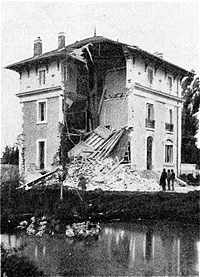 M. Brun, pharmacien-chimiste, propriétaire d'une superbe villa, de construction récente et dont les travaux sont à peine achevés, y avait installé un appareil à acétylène, fonctionnant de manière à ne laisser dégager le gaz qu'au fur et à mesure de la consommation. Le 9 octobre, il essayait un chauffe-bains, avec le constructeur de cet appareil, lorsque, partant des sous-sols, une explosion se produisit, accompagnée d'une formidable détonation, entendue à plusieurs kilomètres de distance. En même temps, les persiennes et volets, réduits en miettes, étaient projetés au loin, les planchers s'effondraient, leurs poutrelles en fer tordues comme des brins de paille. Tout un angle du bâtiment s'était écroulé, et telle avait été la violence de la répercussion qu'il ne restait plus trace de vitres aux fenêtres des habitations voisines.