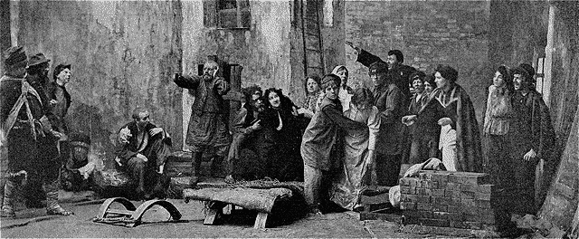 La scène que nous reproduisons, d'après une photographie prise au Théâtre Artistique de Moscou, où les Bas-Fonds furent créés sous la direction de l'auteur, montre précisément les deux femmes aux prises: Natacha, échaudée par Vassilissa, est défendue par Pepel, tandis que Vassilissa est retenue par la foule des vagabonds.