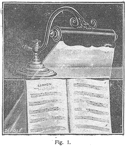 Les figures 1 et 2 représentent l'application de 1'«Américaine» aux pianos: au moyen de l'inclinaison du volet mobile, les rayons lumineux sont tous concentrés sur la musique et la lampe est complètement cachée à la vue de l'exécutant. La hauteur est calculée pour permettre de tourner facilement les pages.