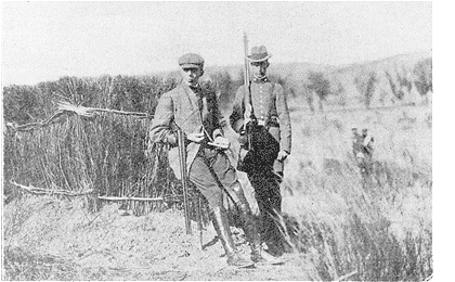 | M. Loubet et son fils, M. Paul Loubet, dans leur abri à la chasse de Rio-Frio. --Phot, M. de Baena. |