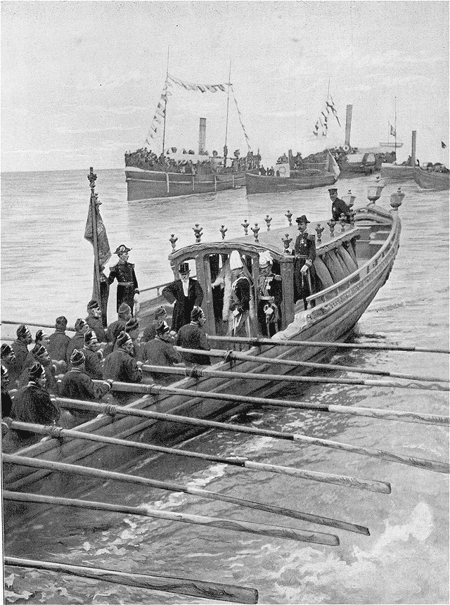 A signaler encore la surprise finale d'une curieuse reconstitution: trois vénérables reliques du dix-septième siècle, trois galères royales, à la proue dorée en forme de chimère, à la vaste cabine d'arrière, tirées exceptionnellement de l'arsenal et équipées de leurs rameurs, au nombre de cent, quatre-vingts et quarante, revêtus du costume des anciens galériens, vareuse rouge et bonnet rouge liséré de jaune aux armes portugaises, maniant en cadence des avirons à manche rouge, à palette blanche semée de dauphins bleus. C'est une de ces embarcations historiques qui, le dimanche 29 octobre, transporta le roi, la reine et M. Loubet à bord du cuirassé Léon-Gambetta, où, avant l'appareillage, devait avoir lieu le déjeuner offert par le président.